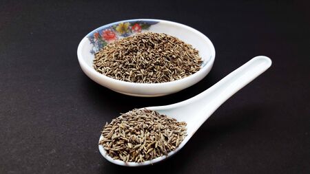 indian spice cumin seeds in bowl and spoon isolated on black background