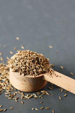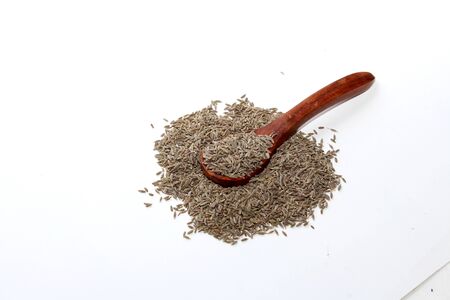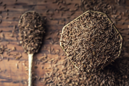 dried cumin seed or caraway in wooden spoon isolated on wooden background