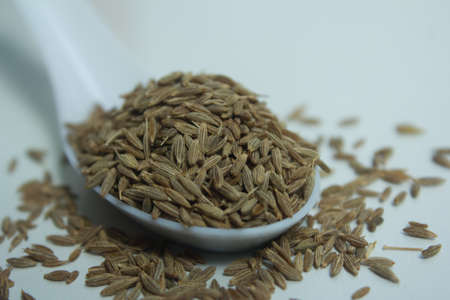 Cumin grain in a spoon composition on a white background. Cumin close up texture. Macro lens.