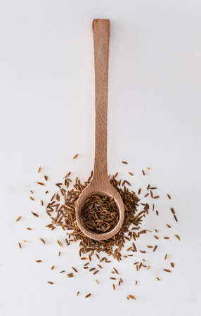 Cumin in wooden spoon isolated on white background. Closeup.