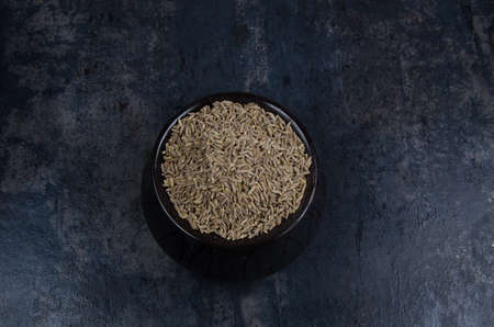Cumin seeds or caraway in white bowl on gray stone background, top view
