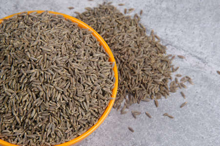 pinch of cumin (cuminum cyminum) seeds close up on gray ceramic plate