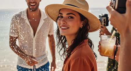 A young woman wearing a straw hat smiles while holding a cocktail on a beach with a man in the background.