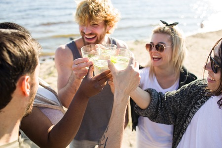 people spending nice time together while sitting on beach, having fun and drinking beer