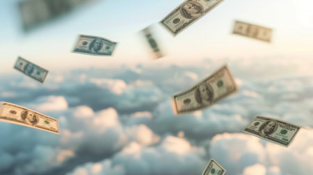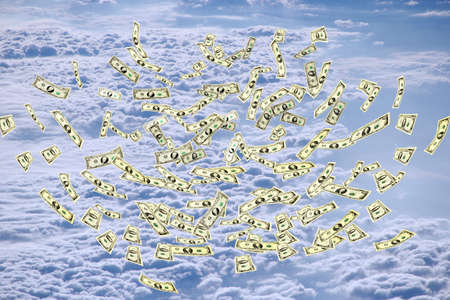 Dollar banknotes flying above white clouds in blue sky. Money in sky. Money flying in heaven. Financial concept. Money on background of cloudy sky
