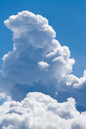 Large cumulus clouds are seen dominating the frame, with varying shades of white and gray contrasting against a clear blue sky. The texture of the clouds appears soft and voluminous. This image could be used for various purposes such as illustrating weather concepts or design backgrounds.