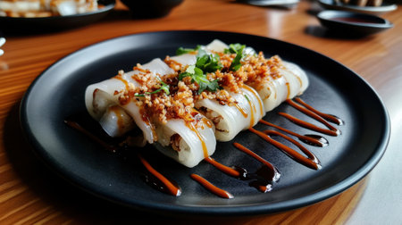 A Delicious rice noodle rolls topped with savory sauce and herbs