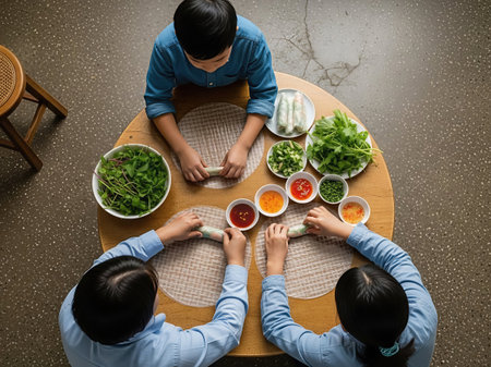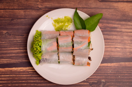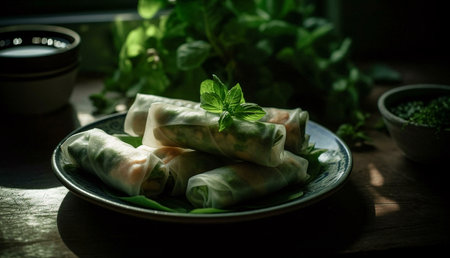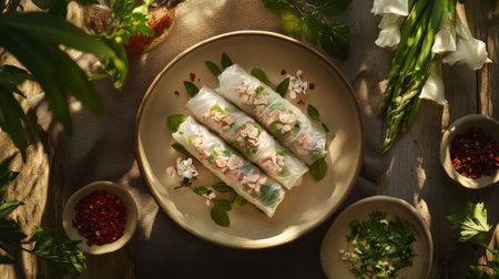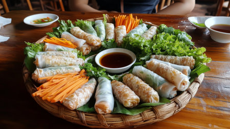 Freshly made vegetable spring rolls served with dipping sauce and garnishes at a vibrant culinary setting