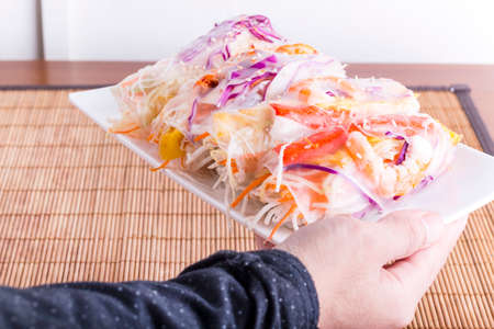 Spring rolls with shrimp, carrots, cucumber, green onions and rice noodles, selective focus