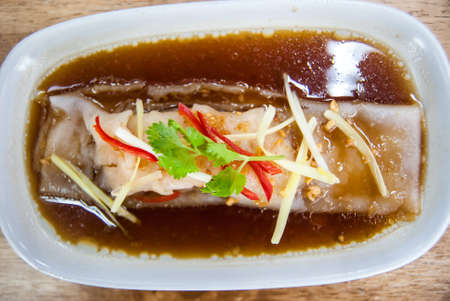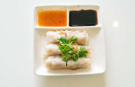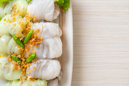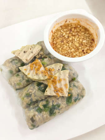 Thai steamed rice skin dumplings vegetables within crispy deep fried chopped garlic paste on. With black sauce on cream ceramic dish
