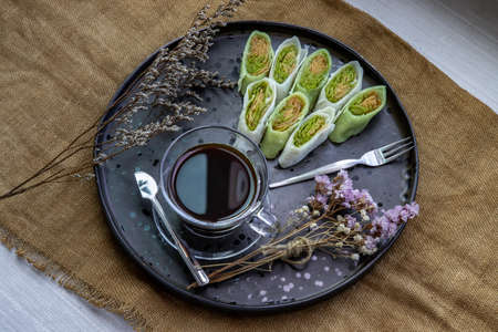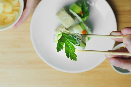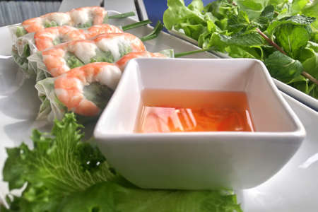 Plate with sauce and healthy herbs. Fresh spring rolls with shrimps wrapped in rice paper