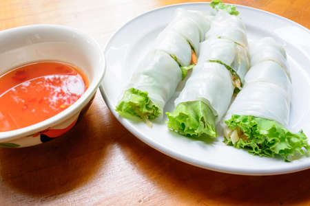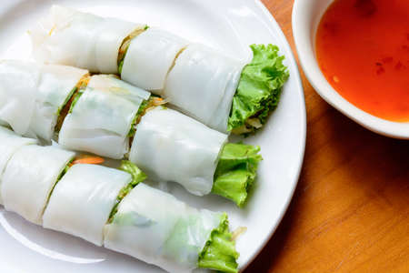 Goi cuon is a traditional spring roll from Vietnam (Vietnamese food), made from meat, shrimp, vegetables, vermicelli, wrapped in rice paper or bánh tráng. served with sauce