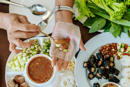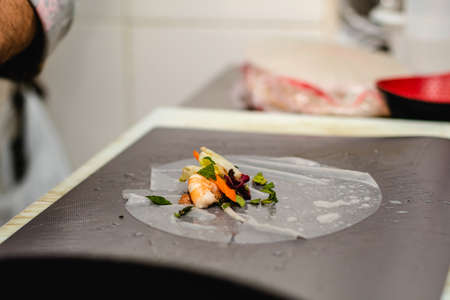 Top view people hand making vegan rice paper rolls, Vietnamese spring rolls by let ingredient as carrot, violet cabbage, sausage, vermicelli, tofu, salad, herbs into rice paper and rolling