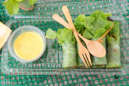 Roll of salad roll Hydroponics vegetable, green leaf lettuce, carrot and crab sticks in a clear plastic box.