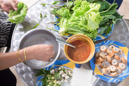 Nam Nueng, a Vietnamese dish, is a dish consisting of vegetable dough, salad, raw bananas, chili, garlic, and pork, then topped with a sweet dipping sauce.