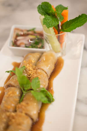 Roll salad is a fusion food. The vegetables are wrapped with large strips nooddle, then sprinkle with sesame seeds and eat with Thai spicy sauce.