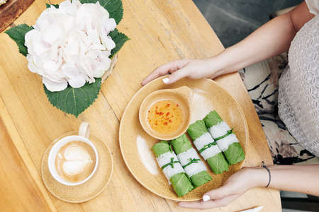 Hands of woman having plate of green spring rolls with spicy sauce for lunch in outdoor cafe, view from above