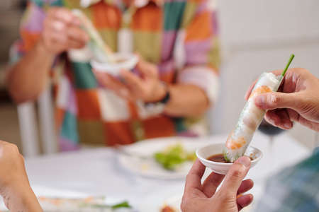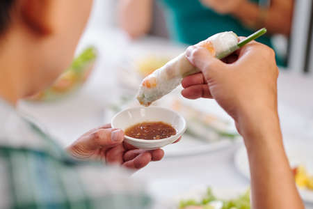 Close-up image of dinner party guest dipping spring roll in small bowl of sauce