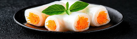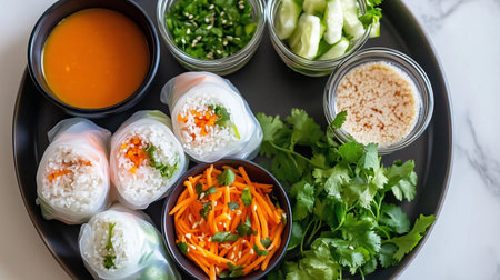 Delight in these fresh spring rolls, beautifully arranged with vibrant herbs and vegetables, perfect for healthy meals. Ideal for food enthusiasts and gatherings.
