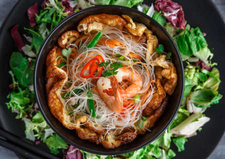Asian salad with rice noodles with shrimps and vegetables closeup.