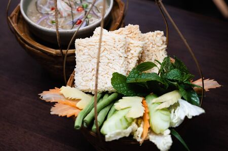 Thai traditional southern rice salad with mix local vegetables in box. Thai called Khao-Yam