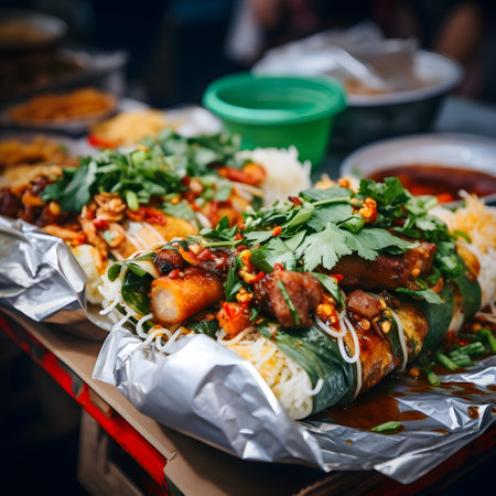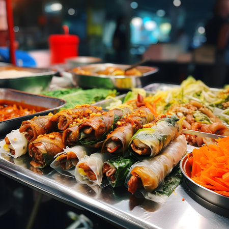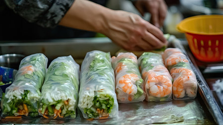 Vendor preparing fresh spring rolls on a street cart, wrapping shrimp and vegetables tightly in thin rice paper for a quick snack.