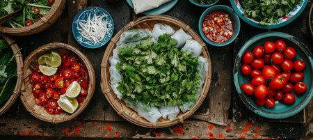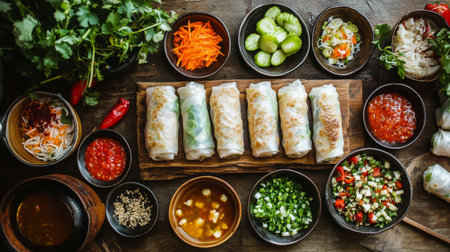 A vibrant display of fresh Vietnamese cuisine featuring rolls, herbs, meats, and sauces on a rustic wooden table, perfect for casual dining or gatherings.