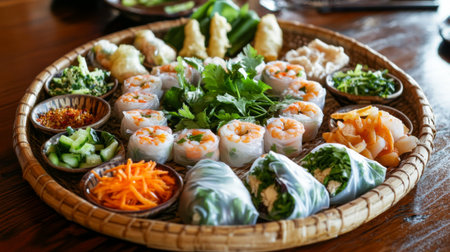 A vibrant arrangement of fresh spring rolls, vegetables, and herbs served in a traditional basket. Perfect for culinary inspiration and healthy dining concepts.