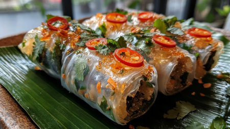 A close-up of crispy spring rolls served on a banana leaf, garnished with sliced chili and cilantro, highlighting the vibrant colors and textures.