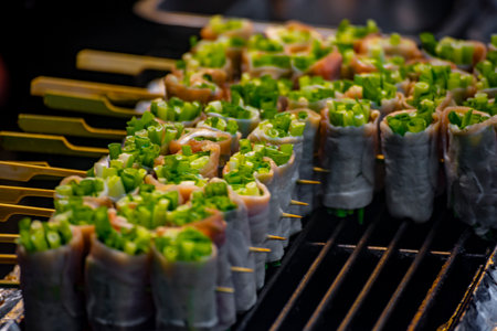 Spring rolls in night market in Hoi An. Asian street food. Vietnam, March 2017