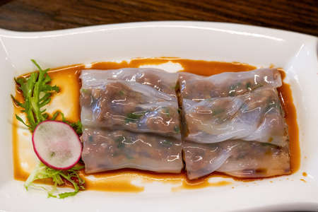 A plate of delicious Cantonese-style morning tea dim sum, steamed beef rice rolls