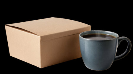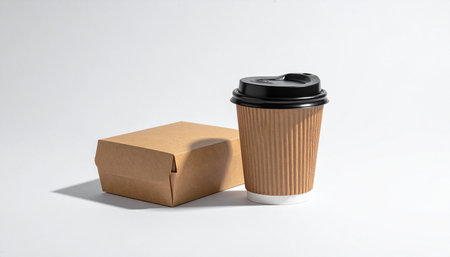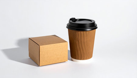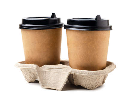 Takeaway coffee cup with brown paper box on white background with shadow.