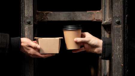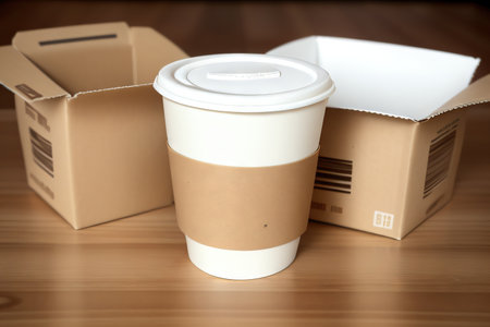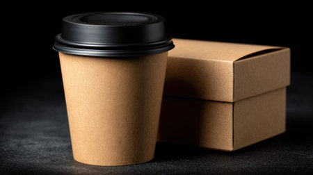 Eco-friendly brown paper coffee cup and box set on dark background.