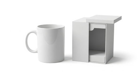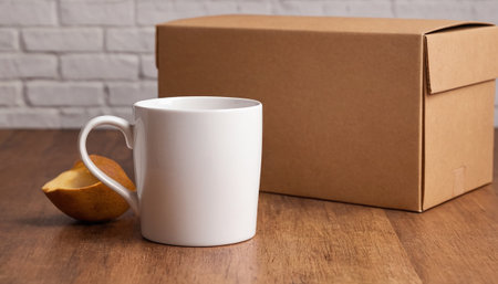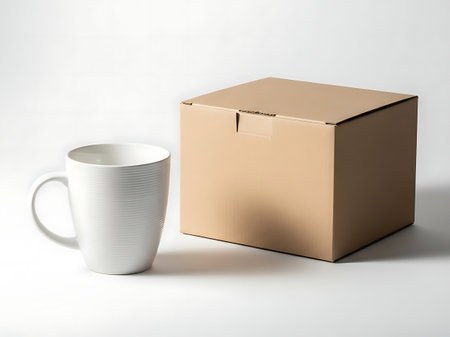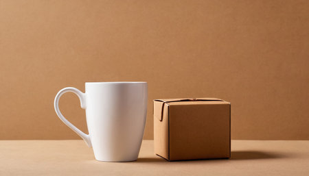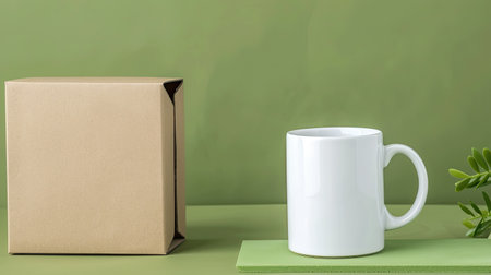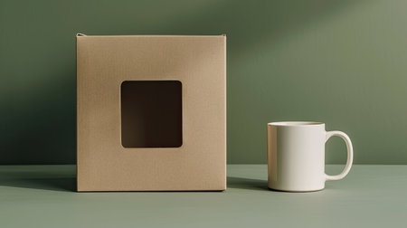 A plain white ceramic mug with a handle sits in front of a cardboard box with a window cut out to reveal the mug inside. The background is a solid, muted green color.