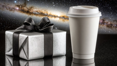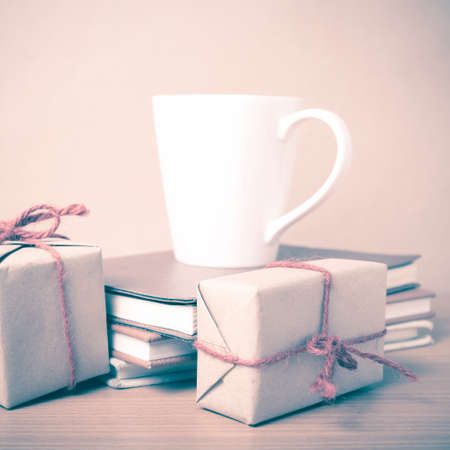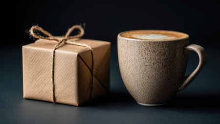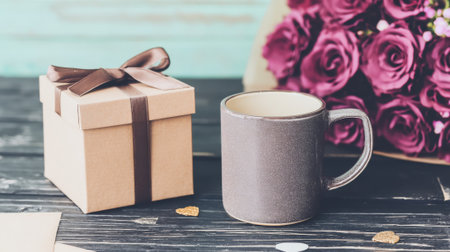 A gift box with a ribbon, a coffee mug, and a bouquet of roses are arranged on a rustic wooden table.