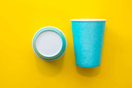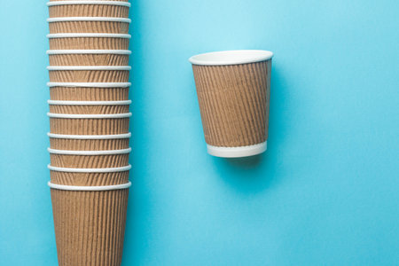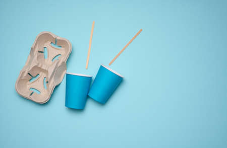 Paper cups on a blue background. Ecological tableware. Minimalistic style. Top view. Copy space.