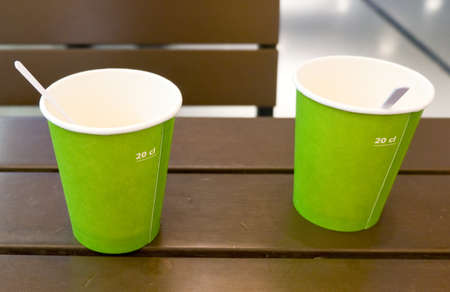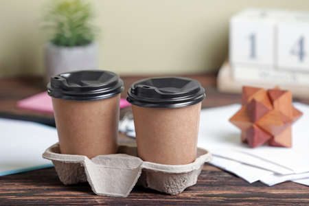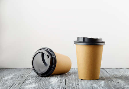 Coffee Time, Two Cup of Empty Takeaway Disposable Coffee Cup on A Wooden Table.