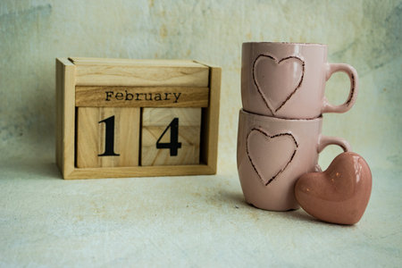 Ceramic cups and heart shaped decoration for St. Valentine Day dinner