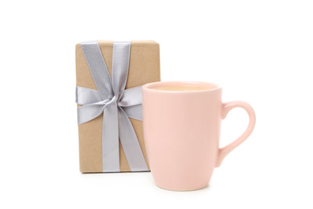 Close up of white mug with a felt mustache and present box on a blue background. Concept of Father's day.