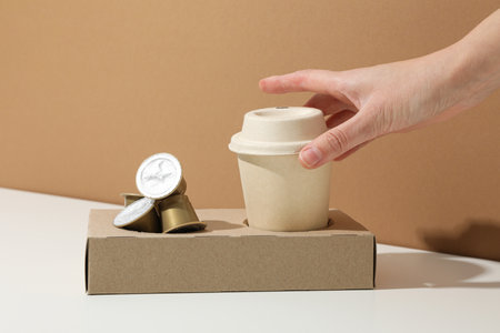 Coffee capsules and paper cup in paper stand and hand on brown background
