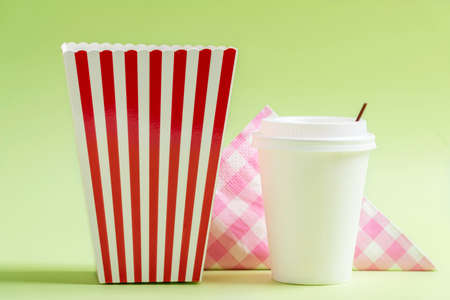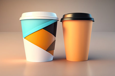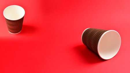 Red paper cups with plastic lids on bright paper backdrops copy space.