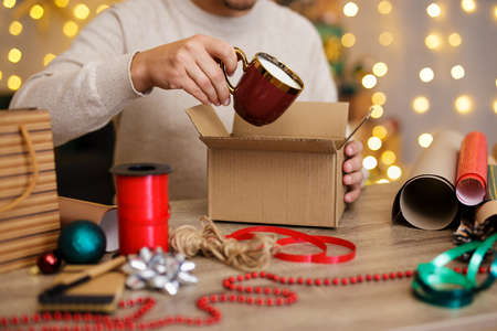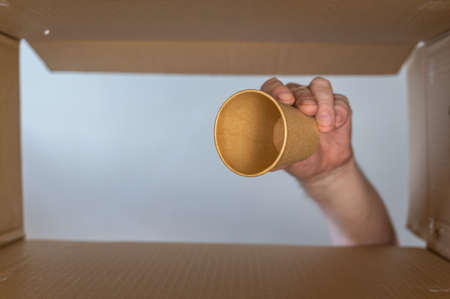 A man's hand puts a paper cup in a cardboard moving box. Disposable drink glass. bottom view. inside view. close-up. selective focus.