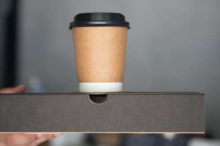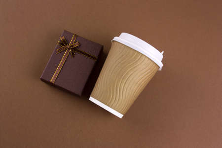 Coffee cup and cardboard box on brown background. Delivery service concept.