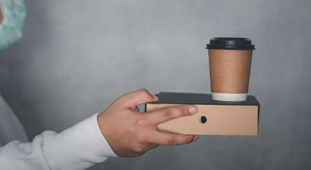 Delivery man wearing medical mask with pizza box and cup of hot coffee ready to deliver food online for quick home delivery and free shipping while staying home during corona virus pandemic