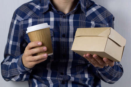 Set of unbleached plant fiber food box and paper coffee cup. Natural fiber eco food and drink packaging. Zero waste
