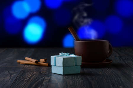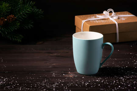 A blue mug stands on a dark wooden background with snow, a gift and fir branches lie nearby.