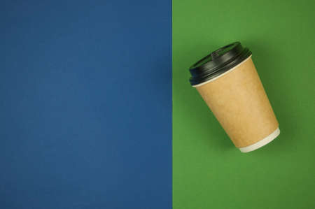 a disposable paper cup of coffee is lying on green and blue background. Top view. Copy space
