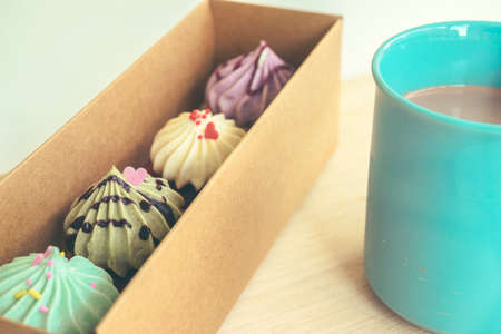 Sweet colorful pastel cupcakes in the box with a cup of chocolate drink ( vintage filter applied)