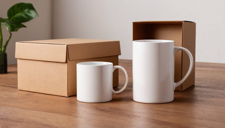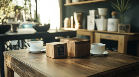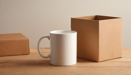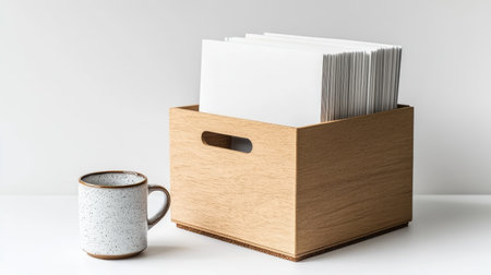 A beautiful wooden box holds blank white papers next to a speckled coffee mug on a clean surface, perfect for a minimalist workspace aesthetic.