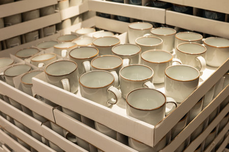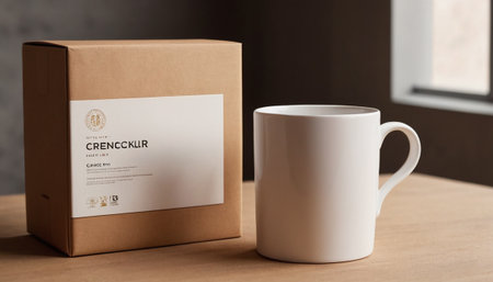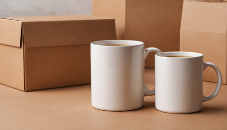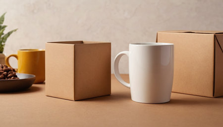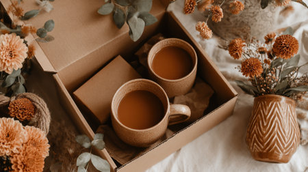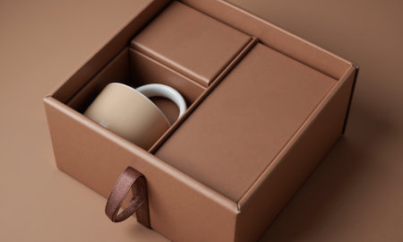 A custom-designed coffee mug box in mocha mousse hues with a glossy, smooth texture. The box features intricate, debossed coffee